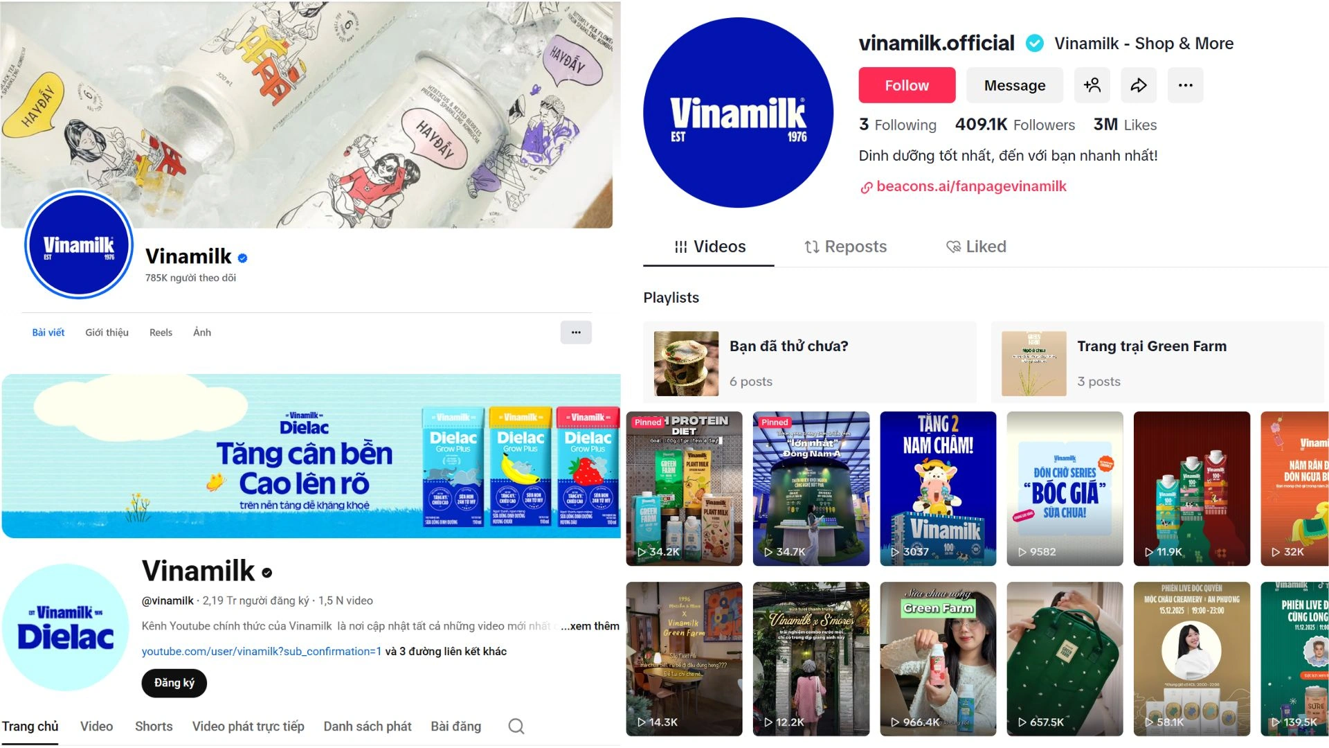 • Trên Facebook, fanpage chính thức của Vinamilk hiện có khoảng 785.000 người theo dõi, duy trì hoạt động đăng tải nội dung đều đặn xoay quanh sản phẩm, kiến thức dinh dưỡng và các chiến dịch PR của Vinamilk hướng đến cộng đồng. Đây là nền tảng quan trọng giúp nội dung thương hiệu được chia sẻ rộng rãi và tạo ra các tương tác tự nhiên từ người dùng.