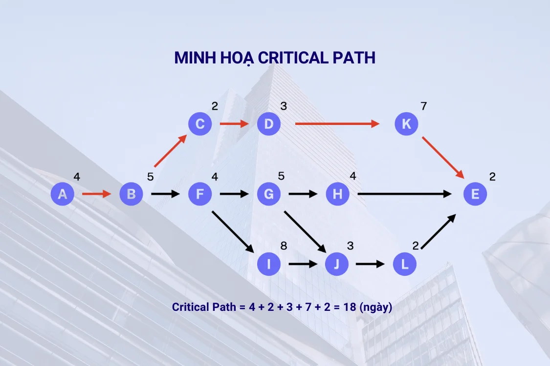 Chuỗi đường găng (Critical Path) là: A → C → D → K → E = 4 + 2 + 3 + 7 + 2 = 18